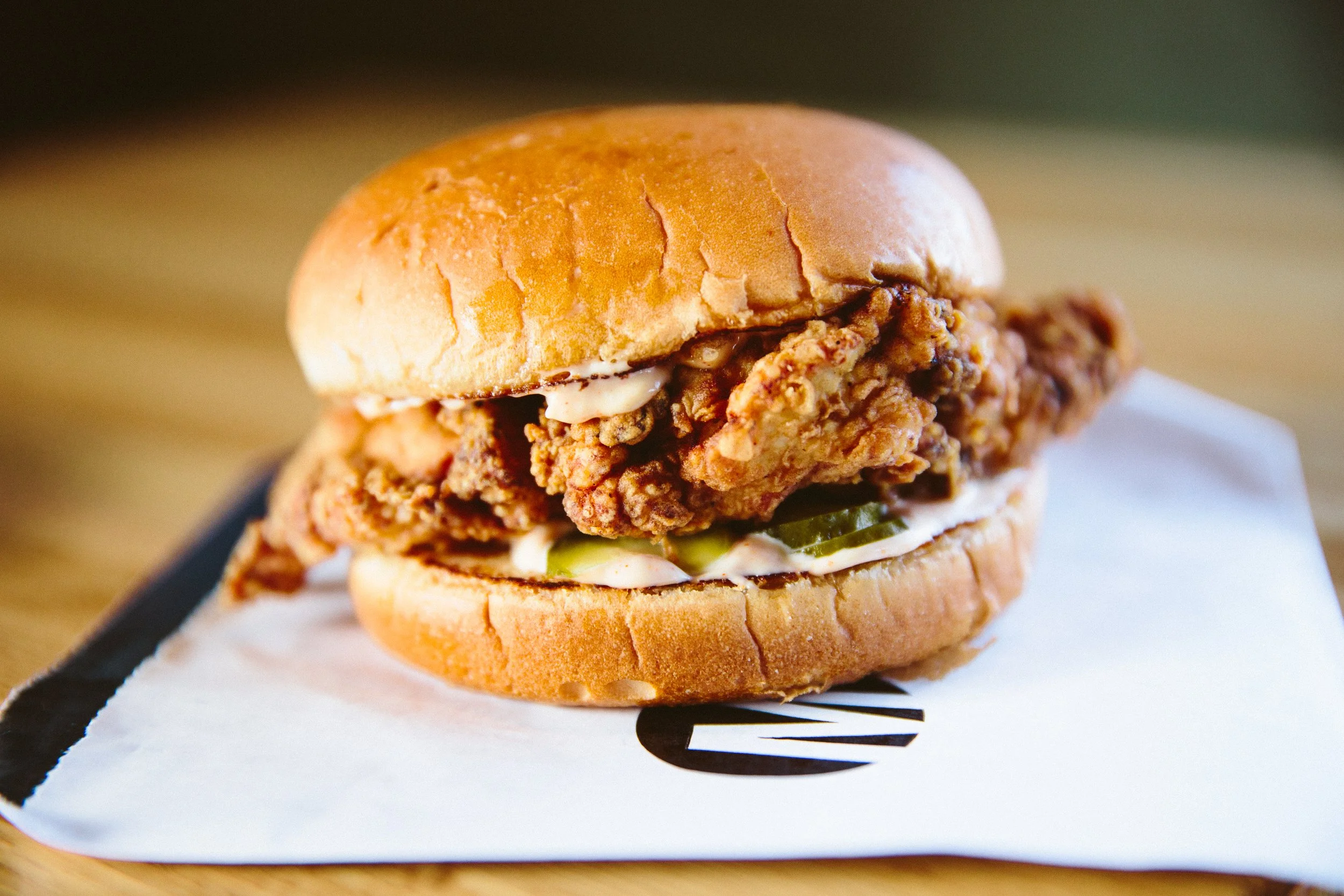 Each box includes fried chicken breast on a bun, chips, pickle, jumbo cookie, and iced tea.
